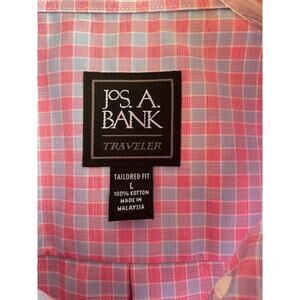 Jos. A. Bank short sleeve shirt in size Large. It is the Traveler series in a soft pink and blue plaid pattern. 100% cotton. Left chest front pocket.