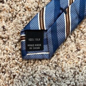 This tie is made by Jos. A. Bank. It’s a 2 tone blue with cream, brown and tan stripes. Made from 100% silk. Smoke and pet free home.