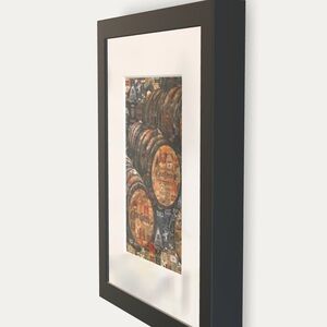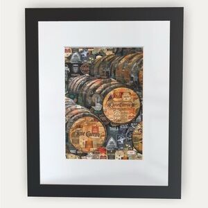 Elevate your space with this framed Jose Cuervo tequila barrel collage art print. Featuring bold vintage labels and rustic barrel imagery, it’s perfect for a home bar, kitchen, or collector’s display. The black frame with white matting enhances its vibrant design, making it a standout conversation piece. Available now to bring a touch of spirited charm to your décor.