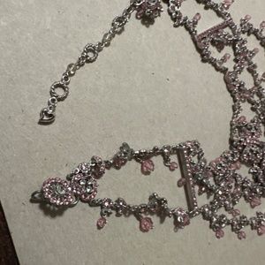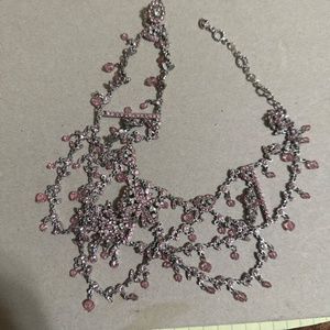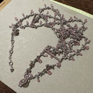 Jose & Maria Barrera Vintage Crystal Drape statement Necklace. Crystals and rhodium hardware combine on this stunning complex necklace. Rhodium plating. Clear and pink Austrian crystals. Chain back with crystal stations. Hook clasp closure with crystal flower attaches to extender chain for adjustable length. Vintage from late 90s/ early 2000s. Worn but in excellent condition with no visible signs of wear. Purchased from Neiman Marcus. Approx. 16” from one side to the other