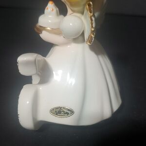 Delightful angel figurine featuring a white dress and gold accents, holding a candle. Perfect for special occasions and adding charm to your decor. 4" tall. no chips or cracks.