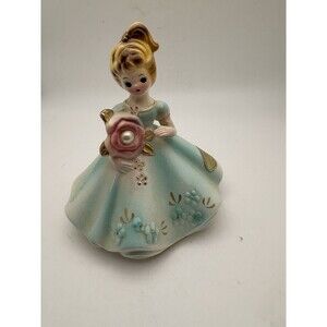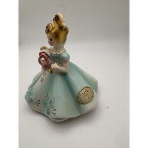 This is a vintage Josef Originals figurine of a little girl in a blue dress with a rose and a pearl birthstone. The figurine is 4 inches in length and was made in Japan.