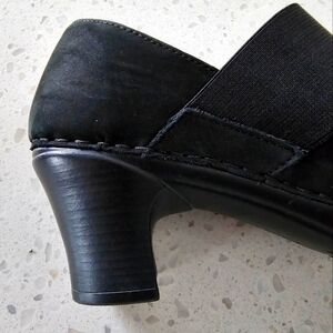 Black Suede Leather Pumps with an Almond Toe, 2.5" Heel and Black Canvas Elastic Fabric Across the Instep. These Mary Janes are Extremely Comfortable and Perfect with Jeans or a Dress.