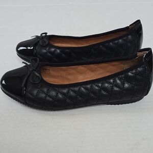 Elegant black quilted ballet flats. Features a glossy toe cap and bow detail. Comfortable and stylish.