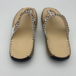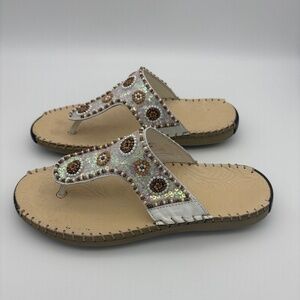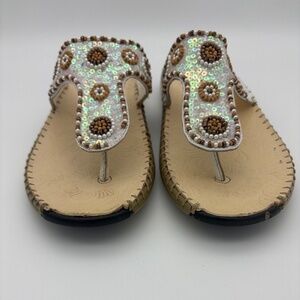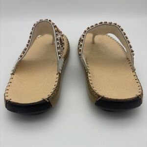 Josef Seibel "The European Comfort Shoe" Tracy Style White/Tan/Brown Sequin/Beaded Thong Flat Sandal; Size 39 (US 8.5); Gentley used with slight wear on inside straps, slight discoloration on front sole (shown in last 3 pictures); Measures 10.75" in length, 4" in width at ball of foot, and 3" in width at heel