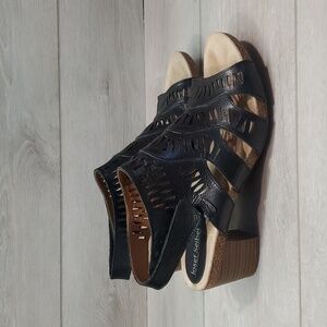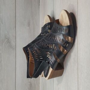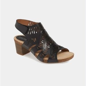 Super stylish black cut out and sling-back peep toe sandals feature a smooth leather upper. An adjustable sling-back strap with Velcro closure ensures a secure fit. The interior features a soft breathable leather lining and fully cushioned foot bed for added comfort. A durable synthetic rubber outsole delivers secure shock-absorbing traction. A stacked block heel measures 2.25 inches.Style: Sunny 02