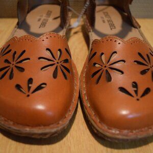 -Mary Jane Style Shoes with vented flower pattern in the leather of the cap toe.