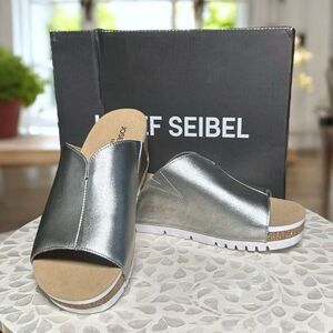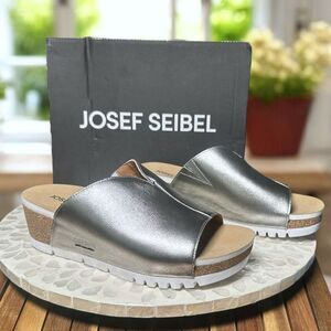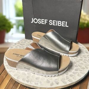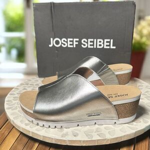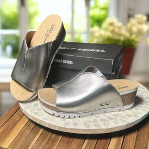 Josef Seibel, Quinn 01, Wedge Sandal, Leather Slide, Comfort Sandal, Slip On, Open Toe, Arch Support, Cushioned Footbed, Lightweight Wedge, Casual Sandal, Summer Shoe, EU39, US8, US8.5, New in Box, Metallic Silver, Cork Wedge, Walking Sandal