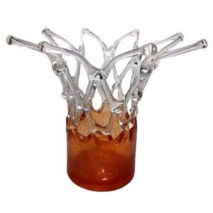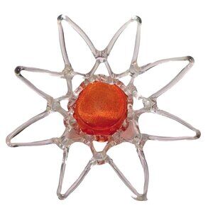 Add a touch of Mid-Century Modern charm to your home decor with this stunning Josefina Krosno art glass vase. The vase features a beautiful lattice, flower, and web pattern in orange, orange speckled, and clear colors, making it a perfect addition to any color scheme. Measuring 10.5" in length, 10.5" in width, and 8.75" in height, this hand-blown glass vase is a unique and original piece from the mid 20th century (1960-1969).