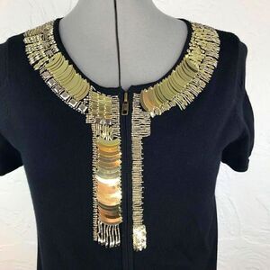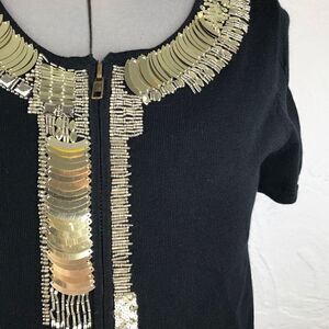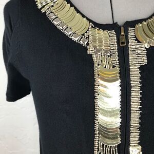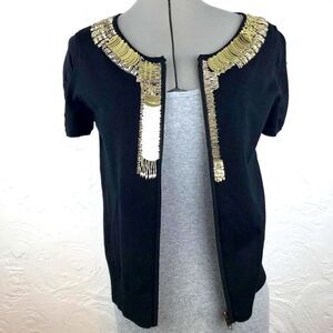 Joseph A Black Knit Short Sleeve Zip Up Cardigan with Gold metallic beading around neck and chest
