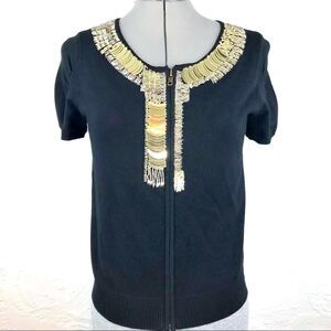 Joseph A Black Metallic Gold Embellished Collar Short Sleeve Knit Cardigan
