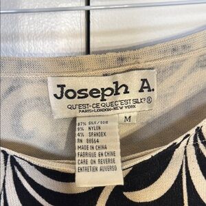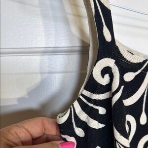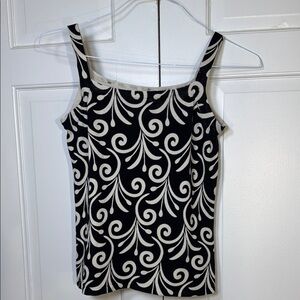This fitted camisole tank top by Joseph A features a striking black and white swirling vine pattern, offering a sophisticated and timeless look. The elegant design makes it a versatile addition to any wardrobe.