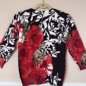 Cheerful button front floral cardigan with 3/4 length sleeves. Length measures approximately 22”. Content:75% rayon/25% nylon.
