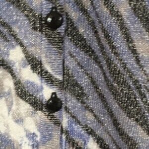 Stunning metallic button front cardigan with 3/4 length sleeves. Length measures approximately 21-1/2”. Content: 85% rayon/10% polyester/5% metallic.