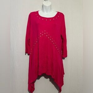 Joseph A tunic blouse in vibrant pink. Features an asymmetrical hem, loose flowy fit, and three-quarter sleeves. Round neckline with decorative metal eyelets. Soft, comfortable fabric. Gently used, excellent condition.