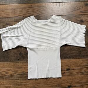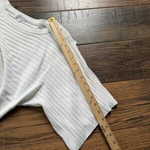 Chic Joseph A ribbed knit short sleeve top in white. Features a soft stretch fabric with horizontal ribbing, button detail along both shoulders, and a fitted waist for a flattering silhouette. Modern and minimal design that works for casual or dressy looks. Size M.