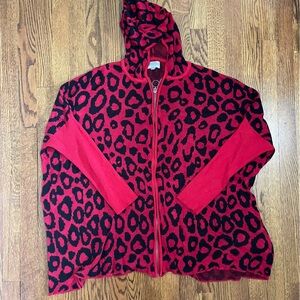 Joseph A. Woman Red Black Animal Print Hooded Zip Sweater Size 1X