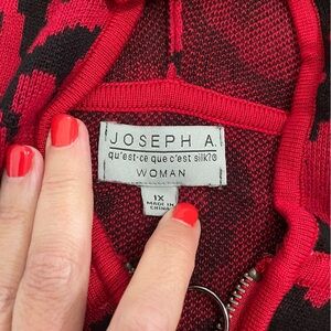 This is a Joseph A. Woman, animal print, red and black, hooded, zipper sweater. The sweater is a size 1X and is 100% rayon. It is mid weight, perfect for layering.