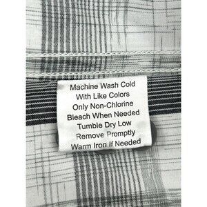 0267B- Joseph Abboud men’s button down shirt, M, long sleeves, plaid, grey, black, white, “Just One Earth”, slim fit, JOE, 60% cotton. 40% polyester, Made in China. Point collar with loops and button underneath. Contrasting trim on cuffs. Buttons hidden behind front placket. Extra buttons included.