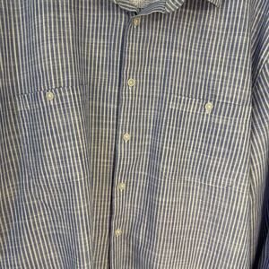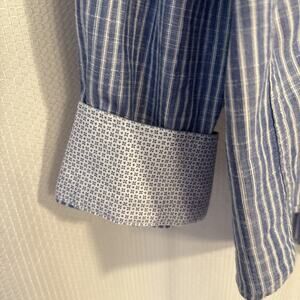 Joseph Abboud men’s XXL button down long sleeve casual shirt. 100% cotton and breathable. Double pockets and accent pattern on cuffs. Nice summer casual shirt. Striped blue and white pattern.