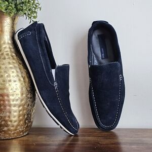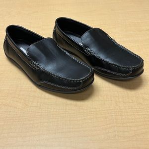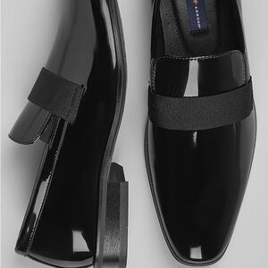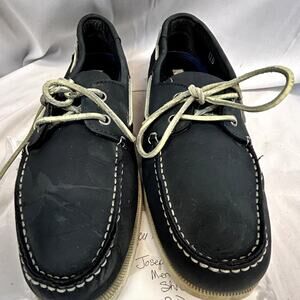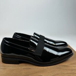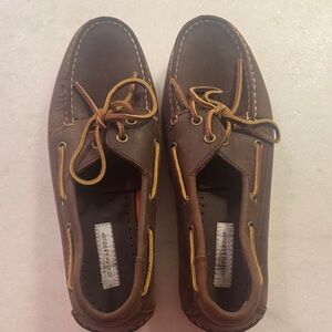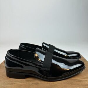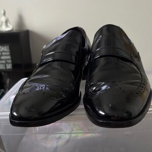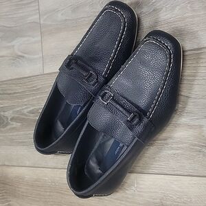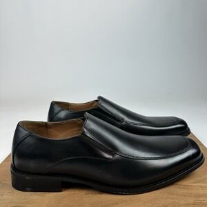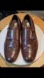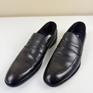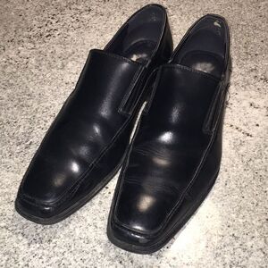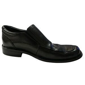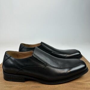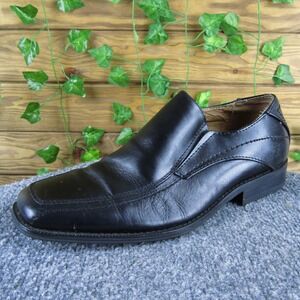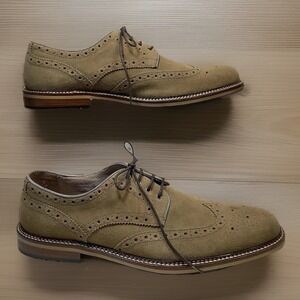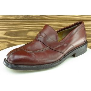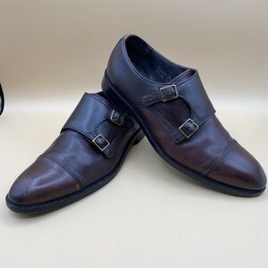 Pre-owned Joseph Abboud men's brown leather double monk strap shoes. Size 9.5. Leather upper shows minor creasing consistent with wear. Leather soles show some scuffs. Features brogue detailing and silver buckles. Shoes are in good condition, showing signs of light use. Approximate dimensions: 12 inches in length, 4 inches in width. Functionality as expected for dress shoes.