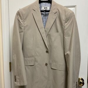 Brand new, never worn, with tags, bought from Men’s Warehouse on sale from $159.99. 100% cotton, lining is polyester, large