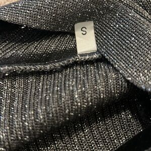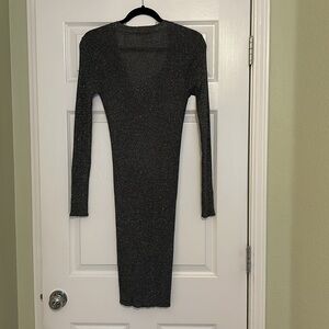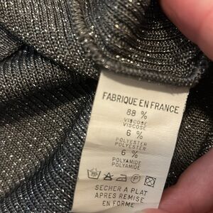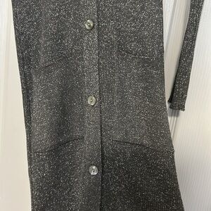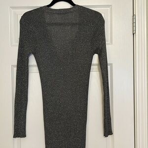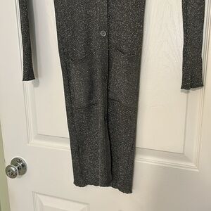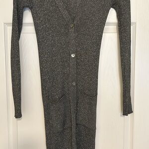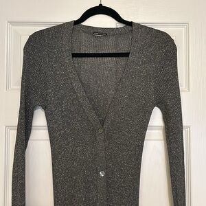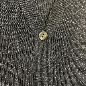 Designer dark grey and metallic silver knit ribbed long line cardigan with v-neck and front pockets. Viscose and Polyester. Made in France.