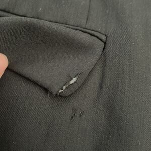 Has a rip on the flap of the right pocket and a little lower on a jacket itself, please see pictures