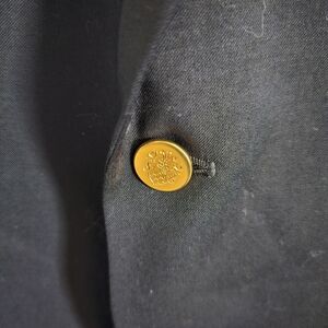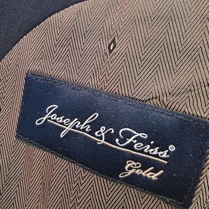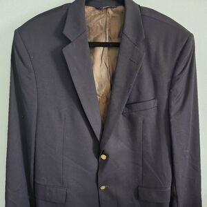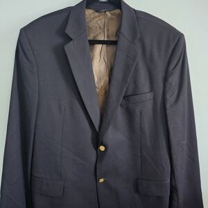 Classic navy blazer by Joseph & Feiss. Features gold buttons. Perfect for formal occasions.