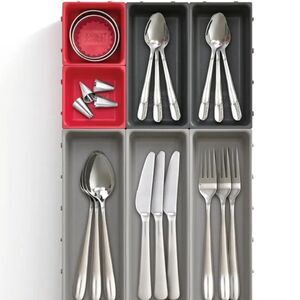 7-piece drawer organizer set in gray and red. Flexible modular design.