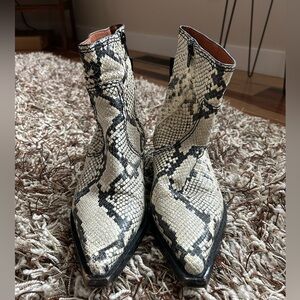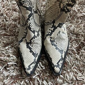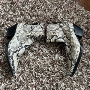 EUC pair of snakeskin pattern leather boots from Joseph. Size 39. These boots are a gorgeous black and white pattern with a zipper closure. Some minor wear on the toes as pictured. Super soft and supple leather. No stains or flaws!