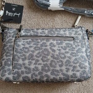 Silver animal print embossed bag with silver hardware. Outside pocket on front. Zipper pocket on back. Zips across top. Beautiful short strap long enough for shoulder and comes with longer strap for crossbody. 9 x 6 x 2.5.
