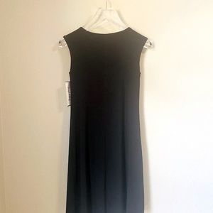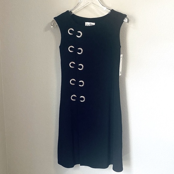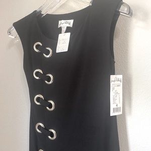 This is such a cute black dress! The silver grommet detail gives it that extra something special. There is a side split that reveals the layer underneath.