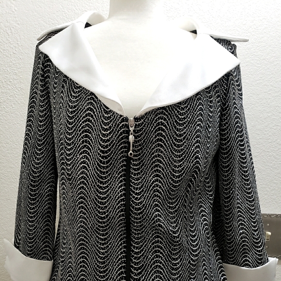 Black and white blouse with two different shimmering silver designs. Silver shimmering dots and waves. White collar and cuffs on sleeves. Black cabochon on silver zipper. Shining with a wavering light.