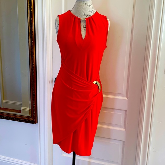 This Joseph Ribkoff Red Dress with gold plated accessories, fit an inch below the knees, never worn!