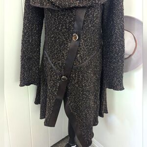 Description: Joseph Ribkoff Asymmetrical Brown Button Sweater Coat 6 Lagenlook Rebel Punk Eclectic Grandma Dark Academia Preppy Cozy, white speckles throughout, beautiful gem-inspired buttons, faux leather detail
