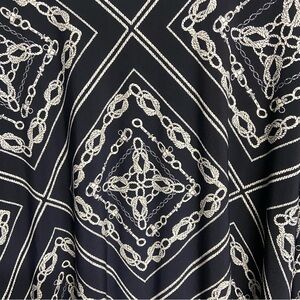 This vintage tunic features a striking navy, and white geometric nautical, pattern with an asymmetrical hemline, offering a bold and modern look. The 3/4 sleeves and flowing silhouette make it a versatile addition to any wardrobe, perfect for both casual and chic occasions.