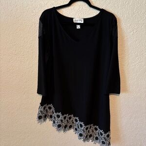 Black daisy flower trim Joseph Ribkoff top women's size 16. Classic styling with a fun daisy trim hemline gives this elegant top a fresh look. The mesh see-through shoulder detail and ample side slit adds a chic, sassy vibe. Featuring 3/4 sleeves, tunic length, v-neck and asymmetrical design.