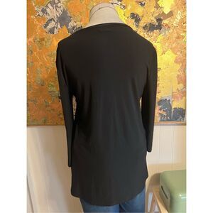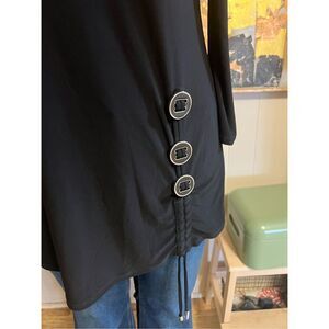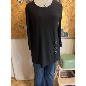I love Joseph Ribkoff! This is a super cool, 3/4 sleeve tunic with a button and rushing detail on one side of the hemline. There’s a drawstring and you can slightly pull up the hem to make it asymmetrical. There are pretty silver and black, shiny buttons. The care and fabric tag has been removed, but this feels like a Poly jersey to hand wash and hang to dry. No flaws noted other than the missing care tag.