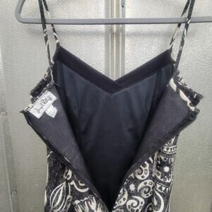Add a touch of elegance to your wardrobe with this beautiful Joseph Ribkoff sheath dress. The dress features a stunning black and tan floral pattern that is perfect for any occasion. The sleeveless design and V-neckline add a touch of sophistication, while the zipper closure gives it a modern twist. Made from a blend of polyester and spandex, this knee-length dress is both comfortable and stretchy. It is lined and wrinkle-resistant, making it perfect for travel. The dress is available in size 4 and is suitable for any season. The dress is a must-have for any fashion-forward woman who wants to look her best. Chest measurement 16-3/4 inches pit 2 pit, length measurement 38-1/4 inches from top of right shoulder strap to hemline.
