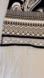 Elegant top with intricate black and gold/khaki patterns. Features a stylish neckline.