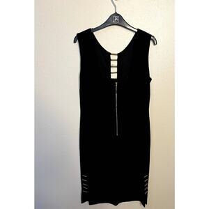 Joseph Ribkoff Black sheath dress with gold back zipper & gold bars details at chest and sides