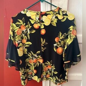 Citrus tree patterned blouse designed by Joseph Ribkoff has a rounded neckline, a two-tier ruffled elbow length cape sleeve, a relaxed waistline and straight hemline falling below the waist.