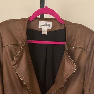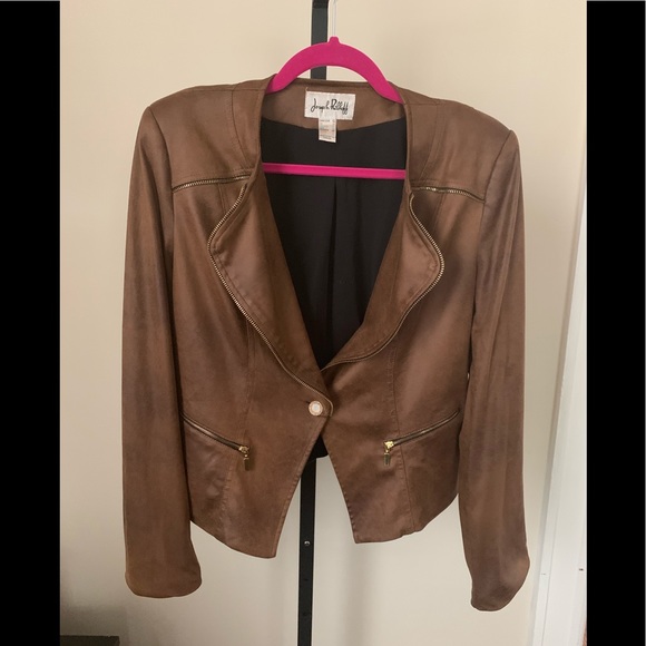 Soft suede like material with gold zipper accents. Single button, lined.