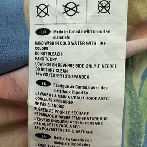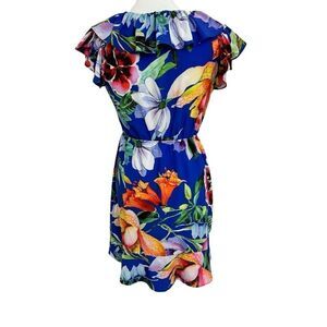 Blue tropical floral print dress. Multicolor flowers. Flutter sleeves. Elastic at waist. V-neck. Faux wrap. Flounce hem. Fabric is very soft with a similar feeling to silk.