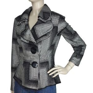 Joseph Ribkoff black and silver chevron print, tiered high collar peplum jacket, two button closure, size 10