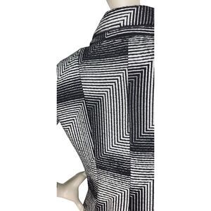 keywords: Designer, Chevron, Peplum, luxury, metallic, silver, black, geometric, runway, rare, hard to find, women's, ladies, zigzag, high collar, tiered collar, stacked collar, statement collar, two button, church, office, cocktail, formal, party, fun,