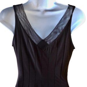 Simple yet detailed with lots of movement, this dress by Joseph Ribkoff has a V-neck in both front and back. Pullover style dress - no zipper. The neckline is trimmed in see-through sheer fabric. The entire dress has seamwork that gives the impression of pleats. Nice flare with movement at the bottom. Made in Canada.