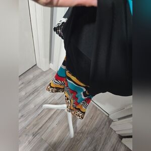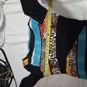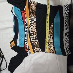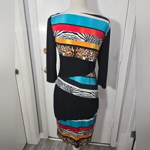 Eye-catching mini dress with vibrant stripes and animal print. Features three-quarter sleeves. Ideal for a bold fashion statement.