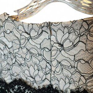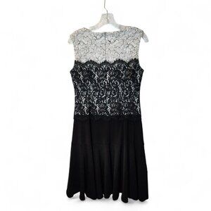 Item specifics: Brand: Joseph Ribkoff | Size Type: Regular | Size: 8 | Dress Length: Knee | Pattern: Lace | Color: Black/Ivory | Material: Polyester, Elastane, Nylon | Features: Stretch, Lined, Scalloped Lace, Flounce Hem | Style: Cocktail/Party | Country/Region of Manufacture: Canada | Vintage: No | Garment Care: Hand Wash Only
